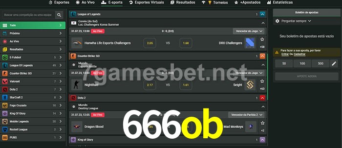 O 666ob oferece uma grande seleção de opções de apostas em e-sports com probabilidades competitivas